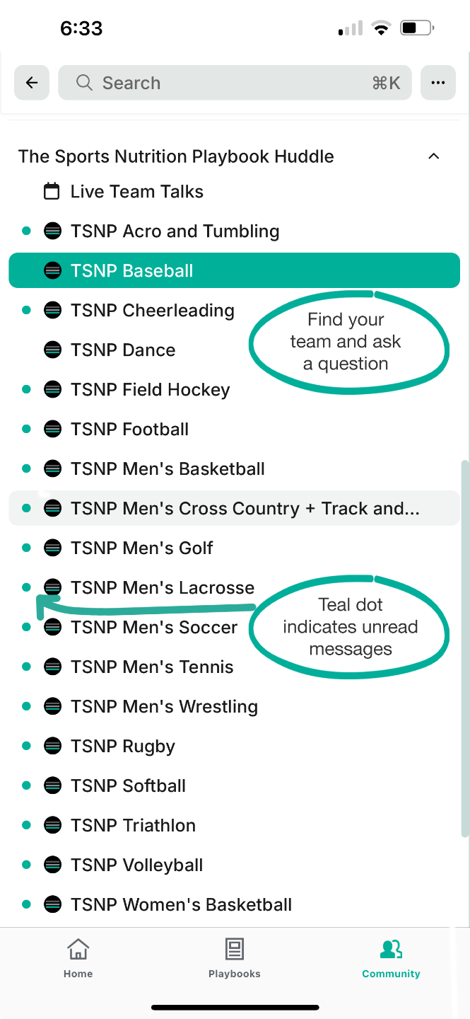 After selecting your team, you can post or respond to the sports dietitian. You can also check notifications and send or read direct messages.